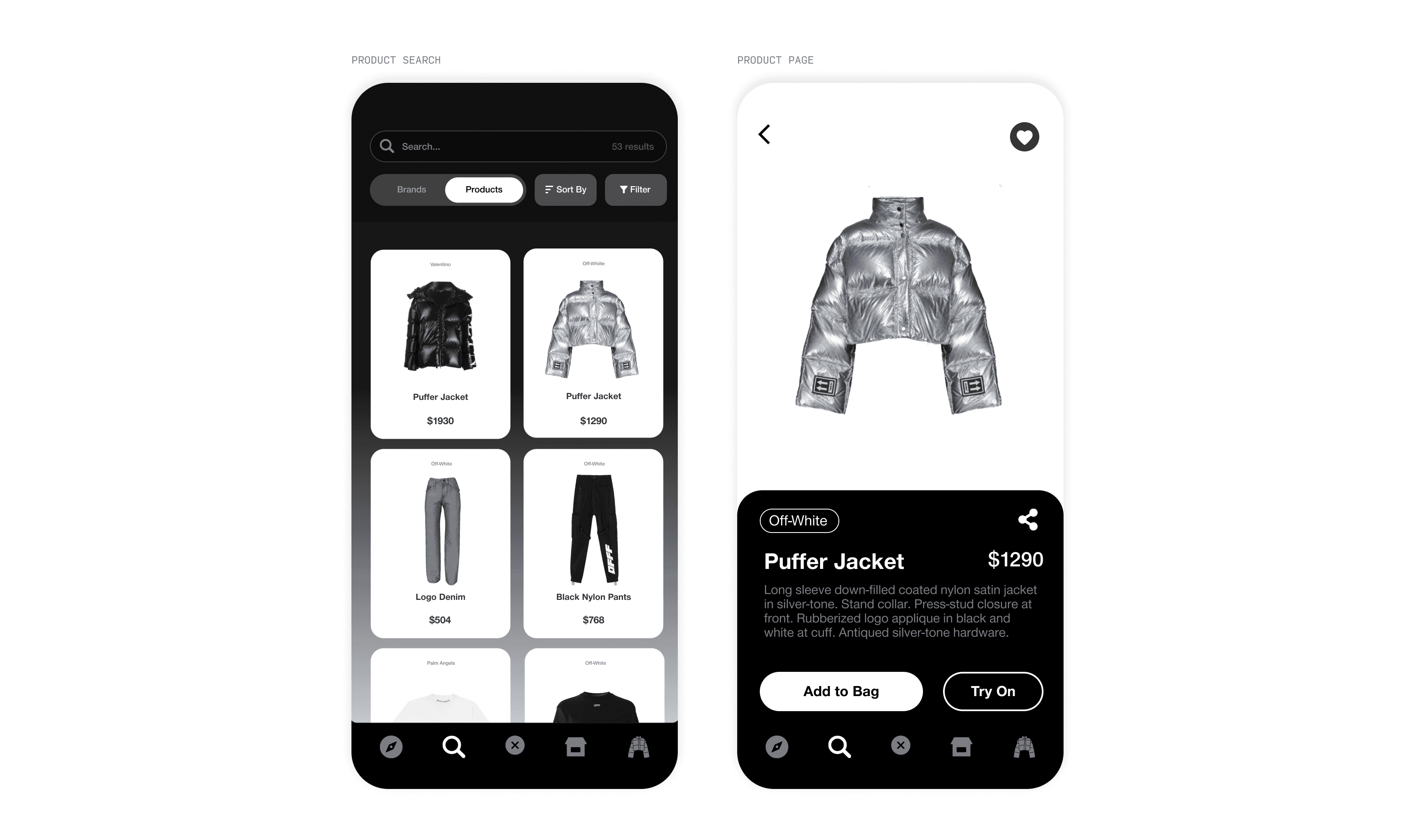 Tapping on a product reveals key details and actions, including add to bag, try on, and add to closet